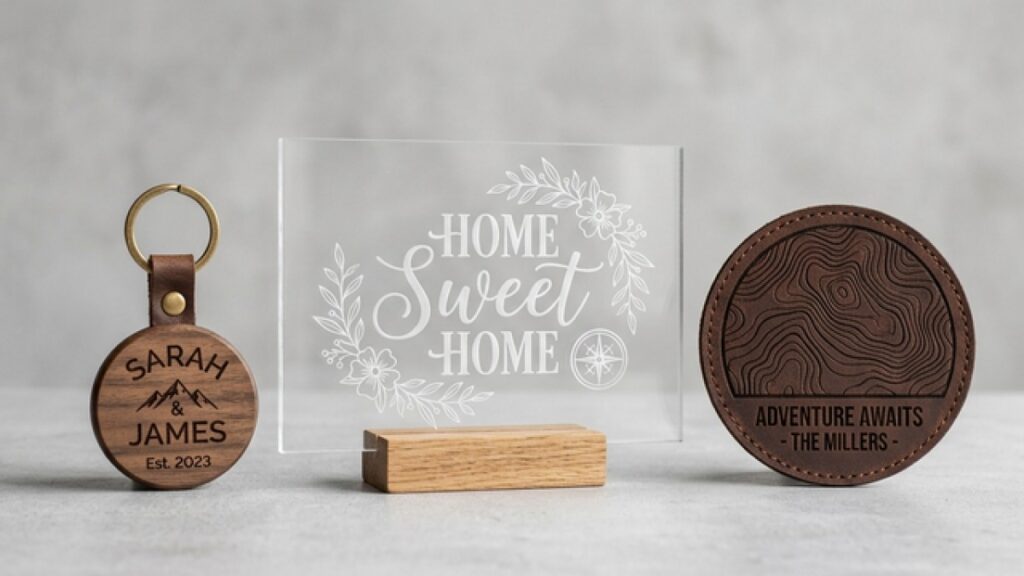 Vegetable-tan leather is a dream to engrave. It takes on a rich, dark char that looks premium and sophisticated. You can start with simple leather patches or precut keychain blanks. Just remember that leather has a unique “burnt hair” smell when processed, so ensure your ventilation system is running!
